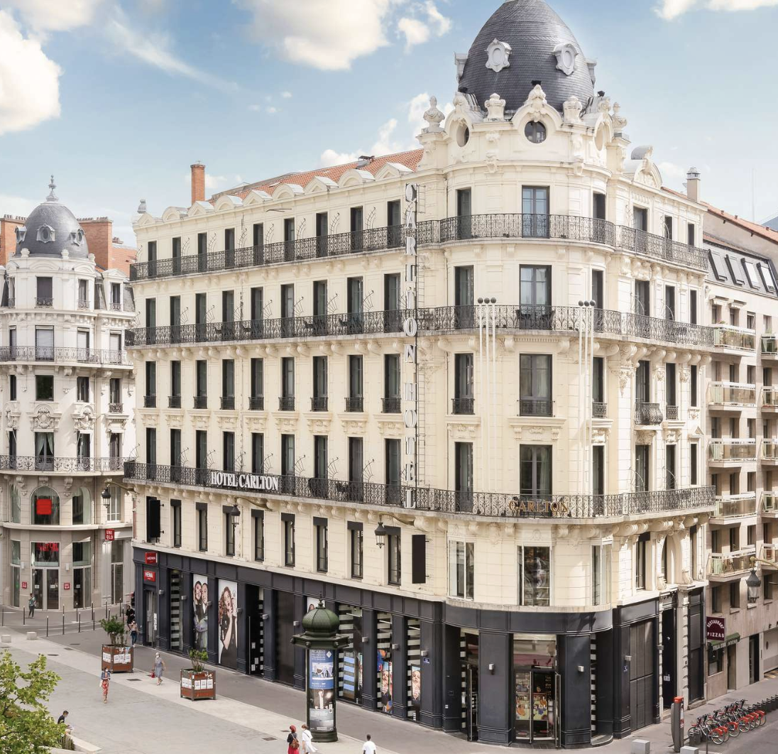 Hôtel Carlton Lyon – MGallery sits in the heart of Lyon’s Presqu’île, the city’s lively central peninsula set between the Rhône and Saône Rivers. This trendy district features a host of cafés, restaurants, shops, museums, and entertainment options, and offers the perfect base from which to explore the city of Lyon. Housed in a lovely cream-colored stone building with wrought-iron railings, the hotel is decorated with red-accented furnishings and offers a breakfast room, cozy bar/lounge, bicycles for rent, spa with massage service (for a fee), and complimentary Wi-Fi internet access. All 80 air-conditioned guest rooms have a private bath with hair dryer, tea- and coffee-making facilities, minibar, in-room safe, TV, and phone.