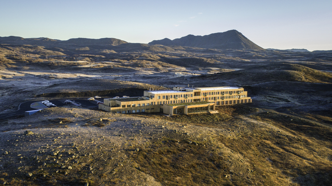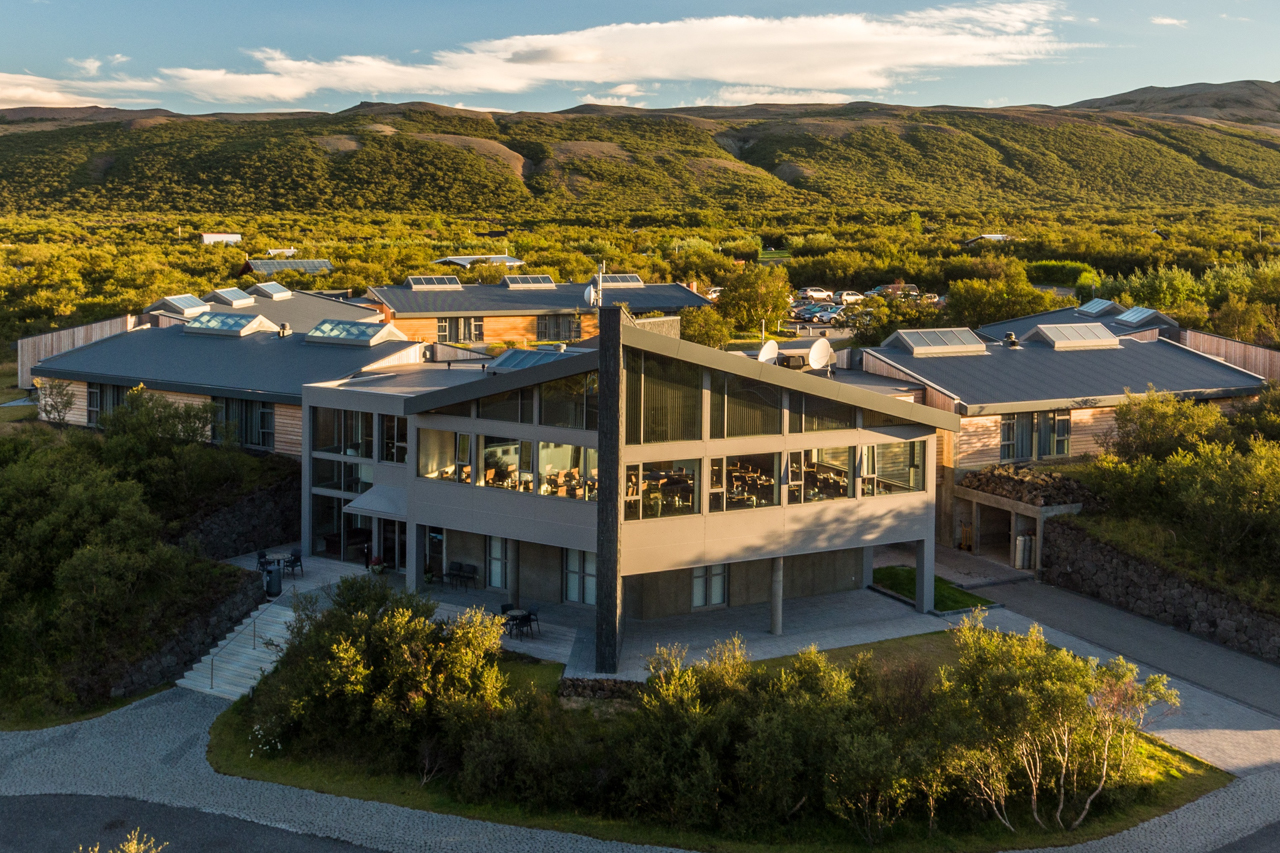 The rural yet contemporary Fosshotel Mývatn features 92 rooms in a spectacular location north of Lake Mývatn. Designed by award-winning Nordic architects using sustainable and ecologically conscious materials, the hotel features timber walls and a grass-thatched roof that blend seamlessly with the surrounding countryside. Amenities include a restaurant, bar with views of the lake, sauna, bicycles for rent, and complimentary Wi-Fi internet access. Guest rooms have private bath with hair dryer, in-room safe, tea- and coffee-making facilities, minifridge, TV, and phone.