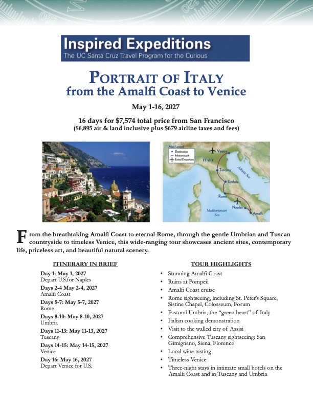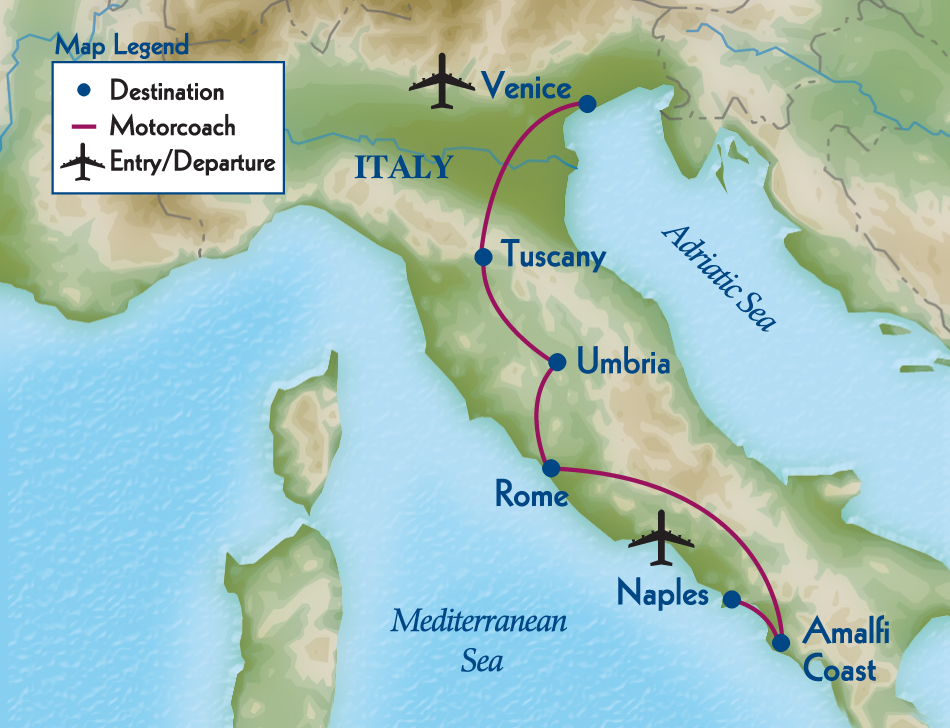 From the breathtaking Amalfi Coast to eternal Rome, through the gentle Umbrian and Tuscan countryside to timeless Venice, this wide-ranging tour showcases ancient sites, contemporary life, priceless art, and beautiful natural scenery.