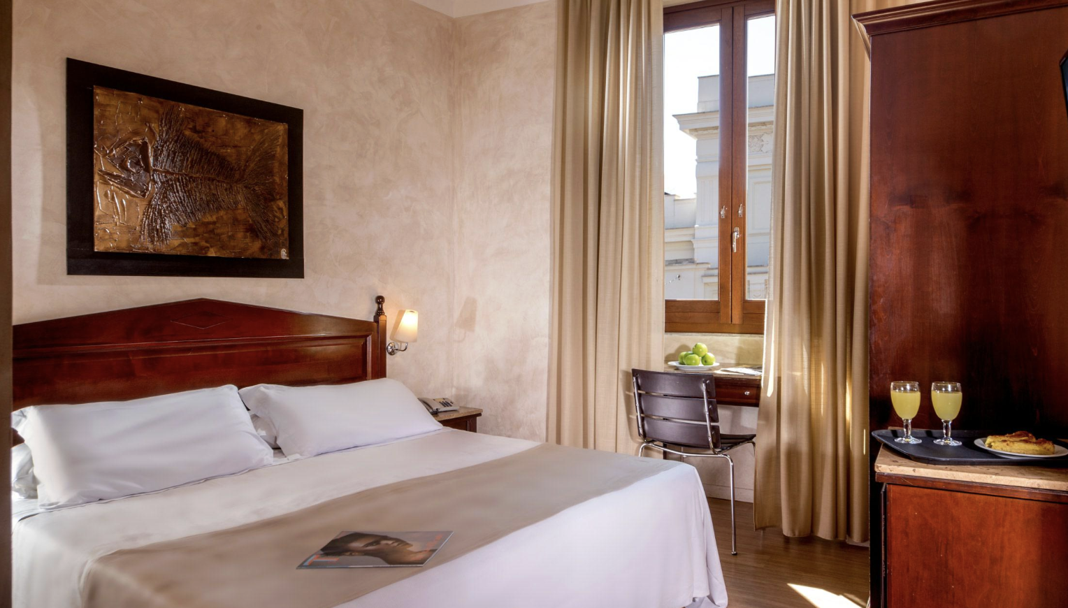 Sitting just a 10-minute walk from Rome’s famed Colosseum, the Monti Palace Hotel occupies a 19th-century building in the heart of the Eternal City. Amenities of this stylish 55-room hotel include a rooftop bar with terrace overlooking the city, library bar and lounge, fitness center, laundry service (for a fee), and complimentary Wi-Fi internet access. Each air-conditioned guest room has a private bath with hair dryer, minibar, tea- and coffee-making facilities, in-room safe, TV, and phone.